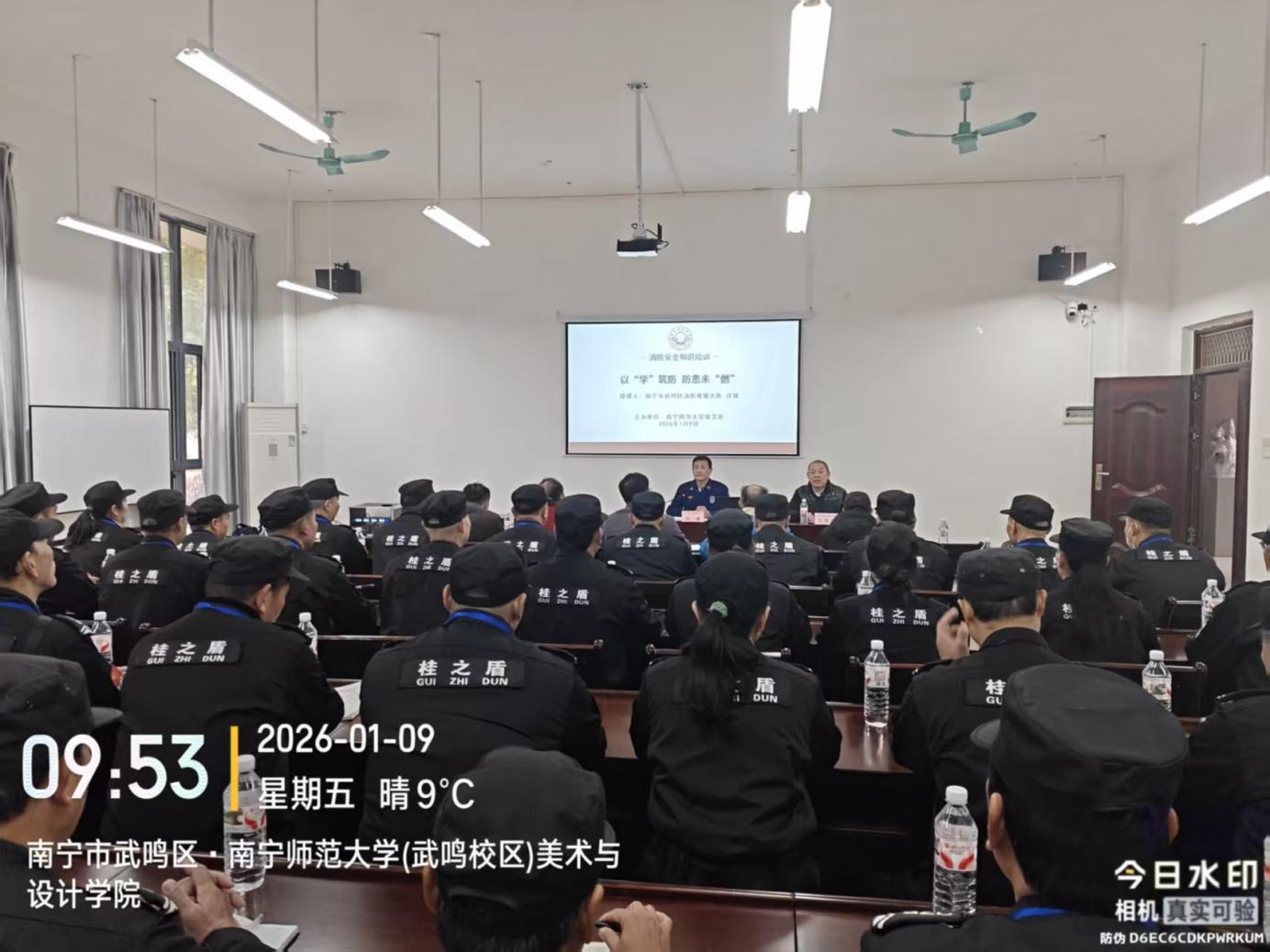 2026年1月9日上午,学校保卫处邀请南宁市武鸣区消防救援大队许锋工程师到武鸣校区给保卫干部和保安人员进行消防技能专题培训。